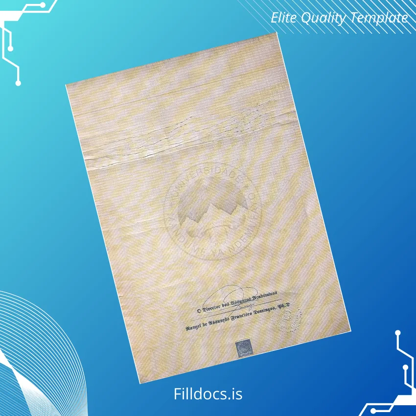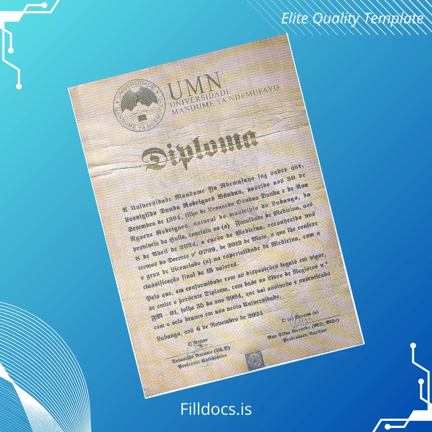 This template is a customizable diploma certificate designed specifically for the Angola Universidade Mandume Ya Ndemufayo Bachelor of Medicine degree. It serves as a blank diploma form that you can personalize with all the essential details including the awardee’s name, degree conferred, date, and signatures. The novelty diploma design is crafted to reflect academic authenticity while being user-friendly for digital editing.