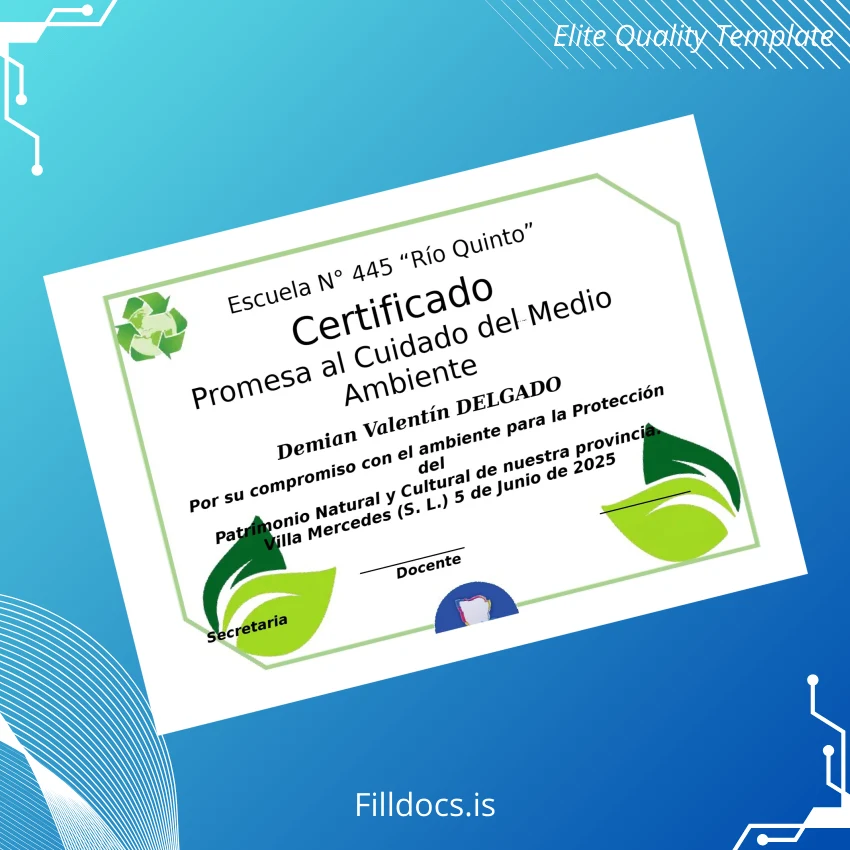 This template is a high-quality, editable digital certificate designed specifically for environmental care accolades associated with Argentina Escuela N° 445 in Río Quinto. Created for ease of use, it offers a flexible framework suitable for various achievements while maintaining a formal and polished aesthetic. Its customizable layout supports your unique text, logos, and signatures to ensure a personalized final product.