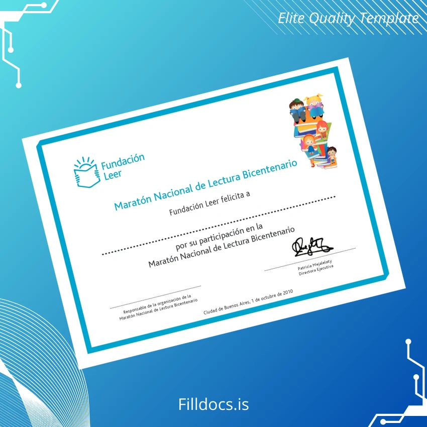 Discover the Argentina Fundación Leer Participation Certificate in the Bicentennial National Reading Marathon Template – Word/PDF, a professionally designed and entirely fillable diploma template perfect for recognizing reading achievements. This versatile digital diploma download offers a flawless combination of editable design and print-ready quality, catering to educators, event organizers, and institutions requiring a customizable degree template for swift issuance of certificates.