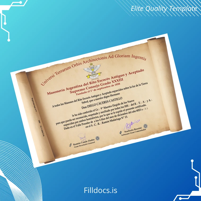 This template is a fully editable digital diploma designed specifically for the Argentina Masonería del Rito Escocés Antiguo y Aceptado Grado XXXIII. It serves as a blank diploma form that professionals can customize with individual details to create a personalized degree certificate quickly and professionally.