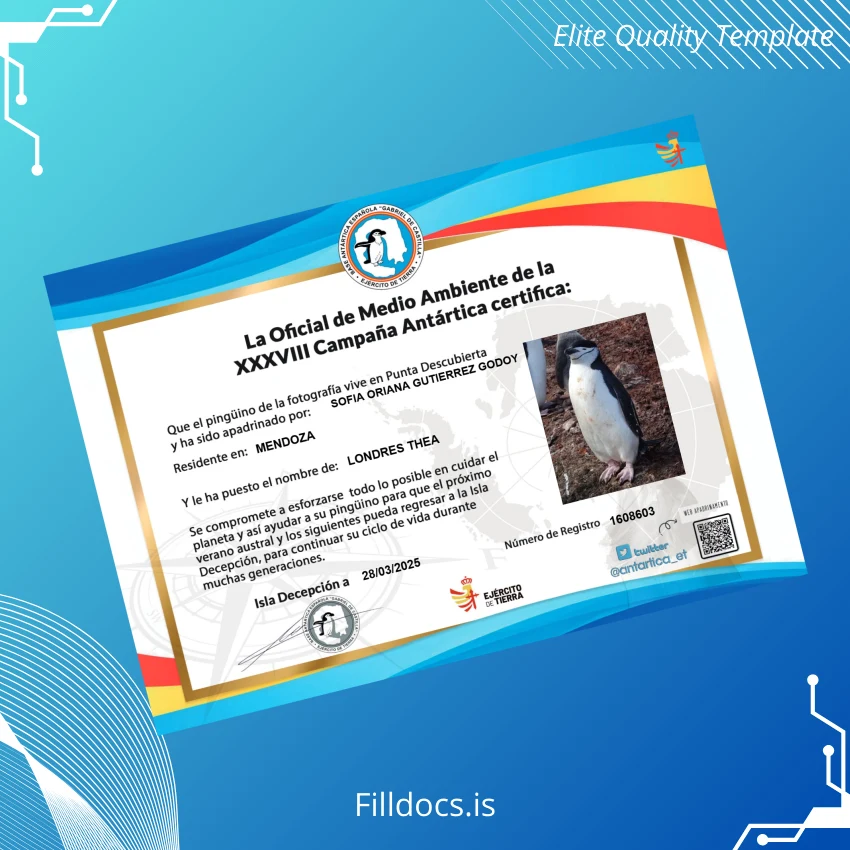 The Argentina Official Certificate of the XXXVIII Antarctic Campaign Template – Word/PDF is a professionally designed, fillable diploma perfect for institutions and individuals needing a customizable and authentic-looking replacement or commemorative certificate. This digital diploma download caters to users seeking a precise and editable document that maintains official standards and branding for one of Argentina’s most prestigious Antarctic campaigns.