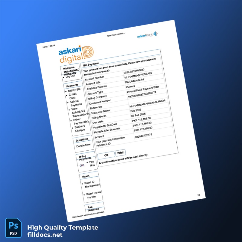 Askari Bank Editable Utility Bill Template in Word and PDF Formats