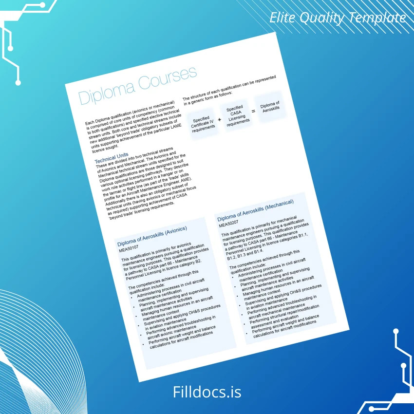 Be the first to review “Australia TAFE NSW Diploma of Aircraft Maintenance Engineering Template – Word & PDF Print-Ready 6 Page”