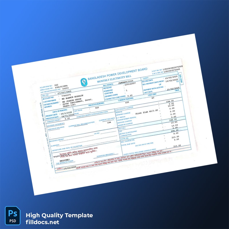 Bangladesh Power Development Board Editable Electricity Bill Template – Your Reliable Utility Document Solution