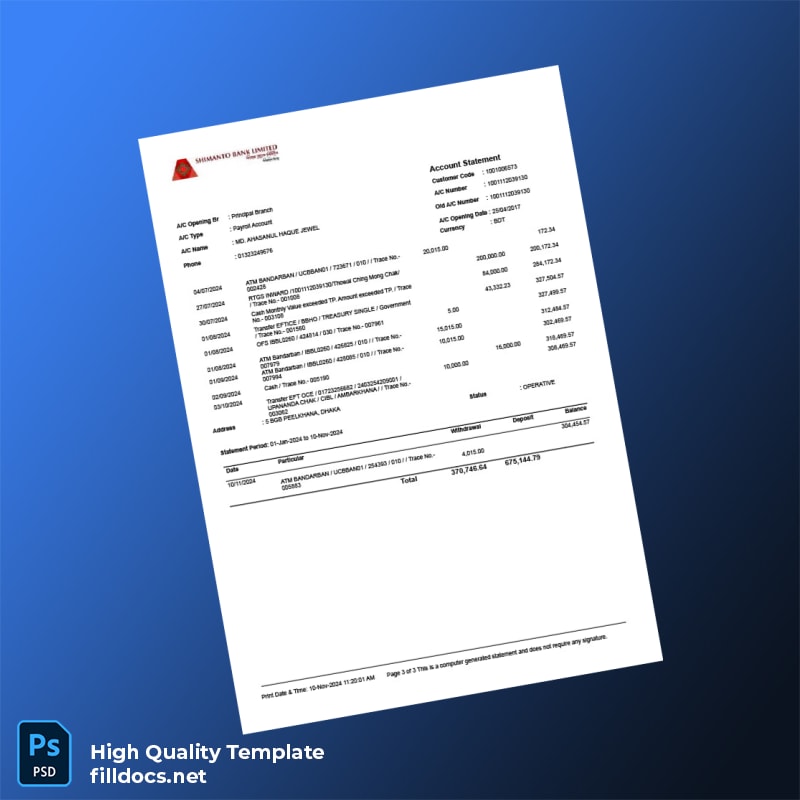 Bangladesh Shimanto Bank Limited Account Statement Template in Word and PDF formats 3 page