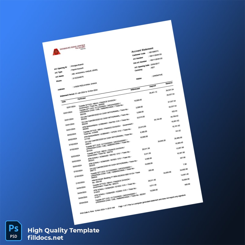 Ready to streamline your document management? Order your Bangladesh Shimanto Bank Limited Account Statement Template now!