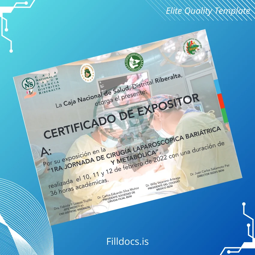 The Bolivia Caja Nacional de Salud District Riberalta Expositor Certificate Template – Word/PDF is a professionally designed, fillable diploma certificate template ideal for creating official replacement or novelty diplomas with ease and precision. This customizable template allows users to seamlessly enter personal details and institution-specific information, ensuring a polished, professional document ready for print or digital use.