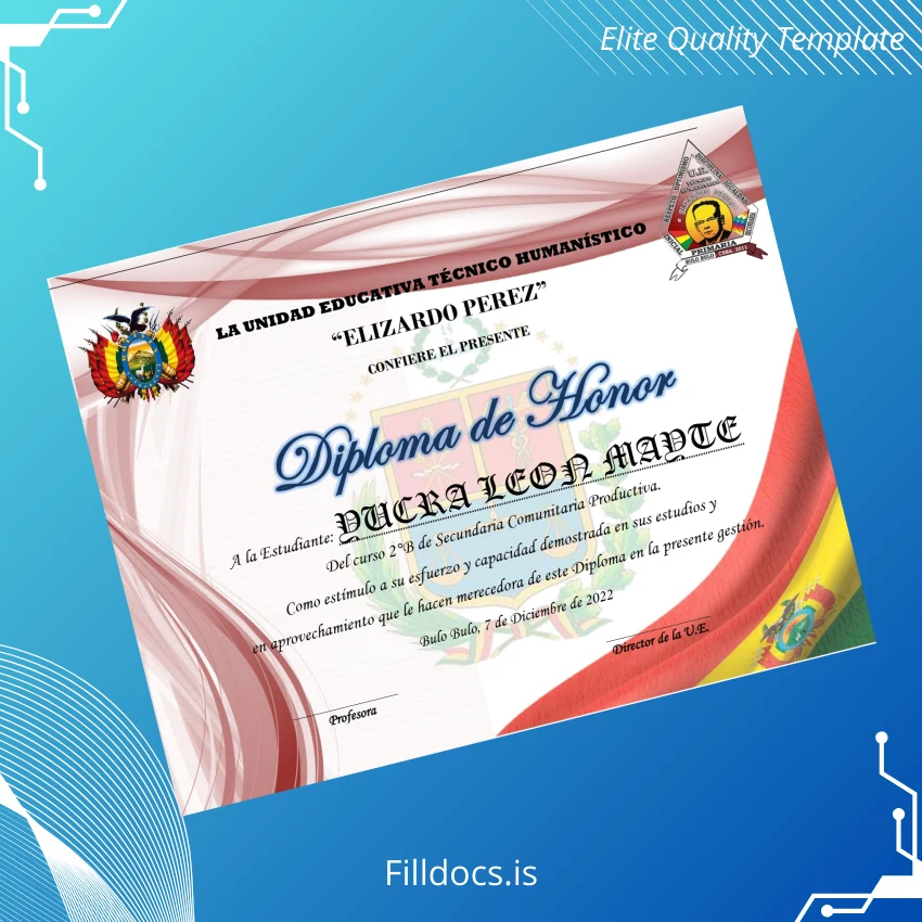 Discover the Bolivia Elizardo Pérez Technical Humanistic Educational Unit Diploma Template – Word/PDF, a professionally crafted, fully fillable certificate designed to meet the needs of educational institutions and professionals seeking a polished diploma replacement or creation option. This template is perfect for those requiring a customizable and high-quality digital diploma solution that supports seamless personalization in Microsoft Word and PDF formats.