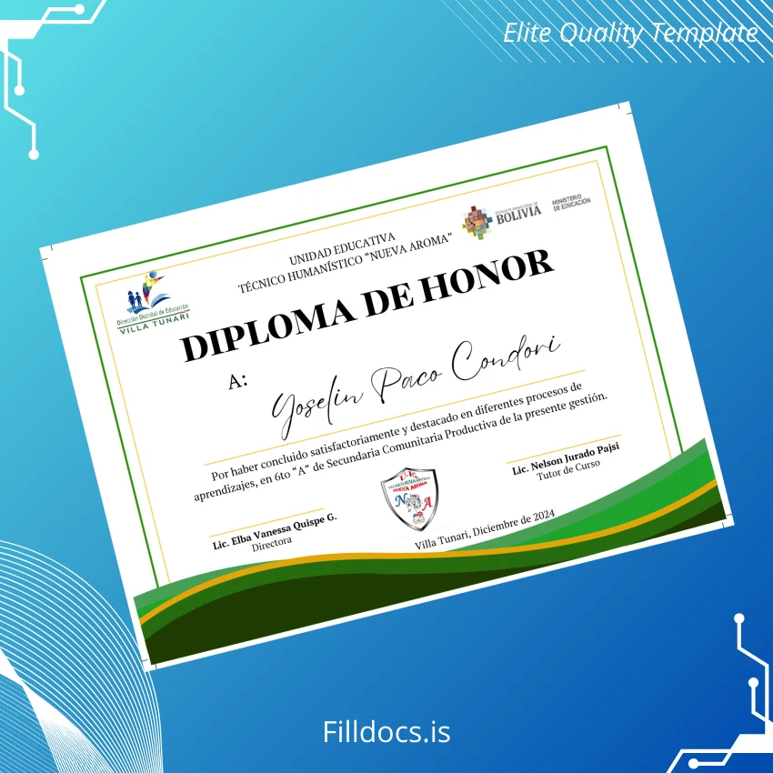 This template serves as a blank diploma form ideal for those needing a high-quality, editable document for academic or professional recognition. It combines elegance with practicality, boasting an innovative novelty diploma design that reflects the prestige of Bolivia Unidad Educativa Técnica Humanística Nueva Aroma. Users can download a digital diploma to quickly replace or customize certificates as needed.