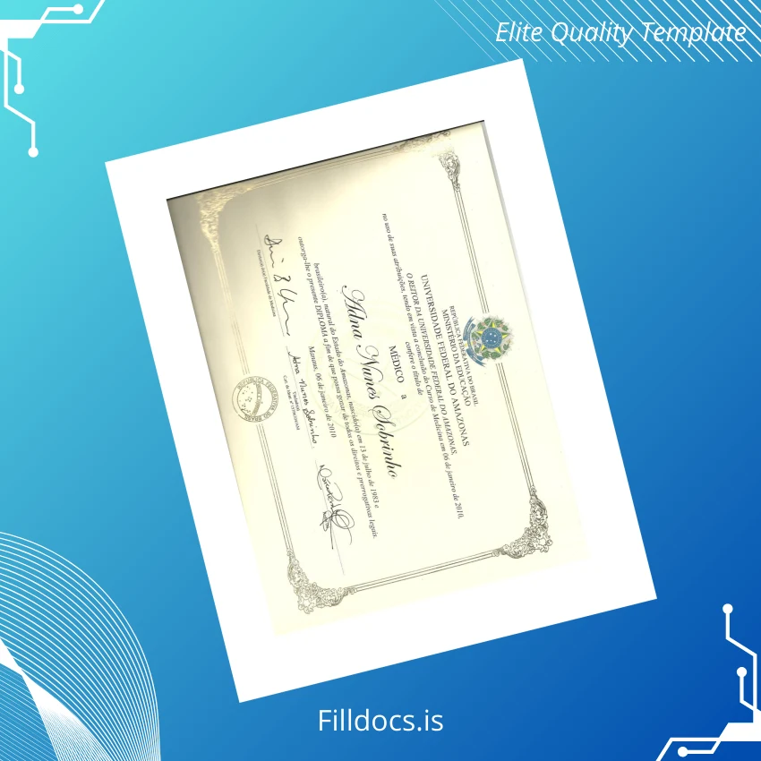 This template is a professionally designed, blank diploma form specifically tailored for the Brazil Amazônia University Medicine graduates. It serves as a fully customizable degree template that allows users to easily input personal and academic details into ready-made fields, creating a polished and authentic appearance. As part of the replacement diploma template category, it is an excellent resource for those needing a reliable and legitimate-looking diploma alternative.