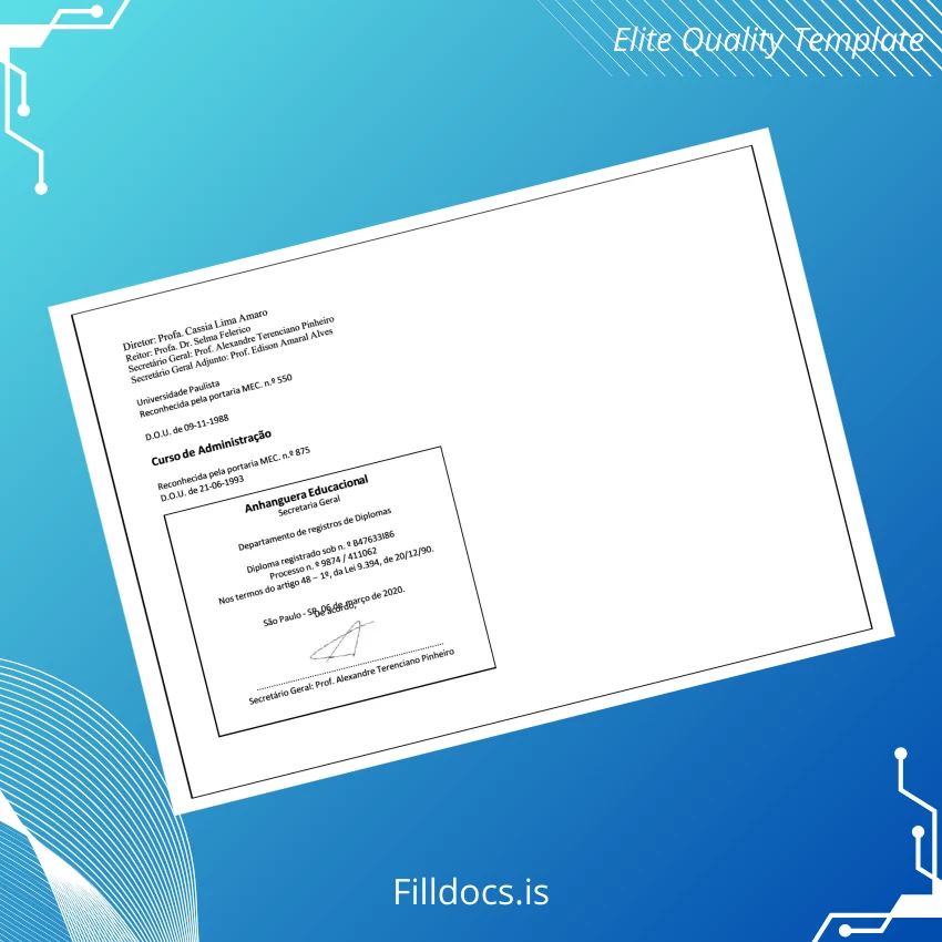 This template is a customizable degree certificate in Word and PDF formats, tailored to replicate the official Bachelor of Administration diploma from Brazil Anhanguera University. It serves as an ideal blank diploma form for those needing a replacement diploma, or users desiring a digital diploma download for personal or professional purposes.