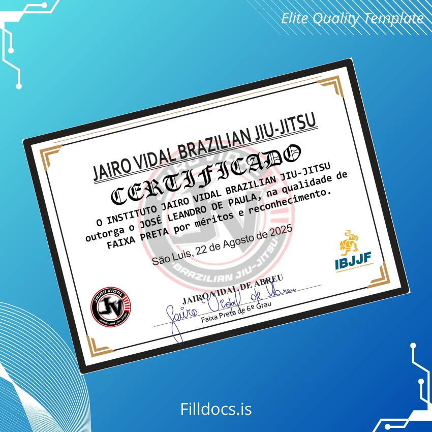 The Brazil Brazil Jairo Vidal Brazilian Jiu-Jitsu Black Belt Certificate Template – Word/PDF is a high-quality digital document designed for martial arts professionals seeking an effortlessly customizable certificate for their accomplishments. This fillable diploma template offers an ideal solution for creating or replacing diplomas with precision and professionalism.