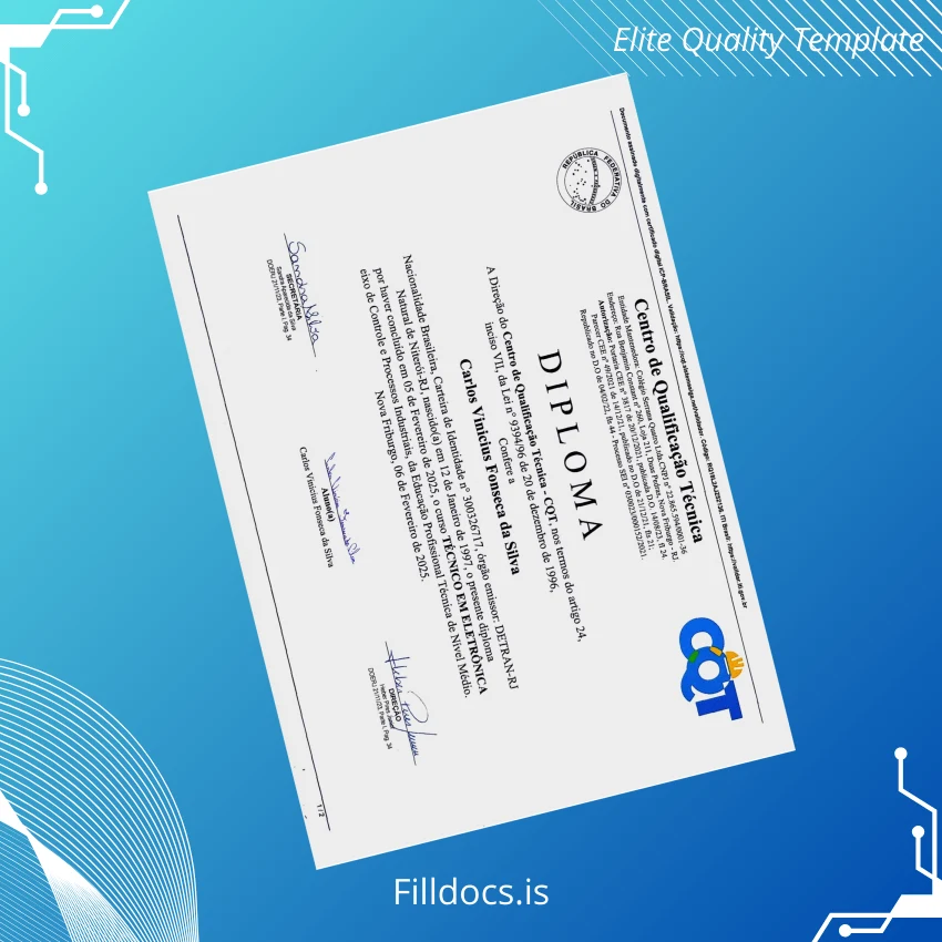 This template is a fully fillable and editable diploma certificate designed specifically for the Brazil Centro de Qualificação Técnica in Electronics. It serves as a replacement diploma template or a novelty diploma design perfect for academic institutions, technical centers, or individuals requiring a professional degree certificate that is crisp, clear, and print-ready.