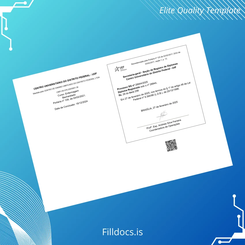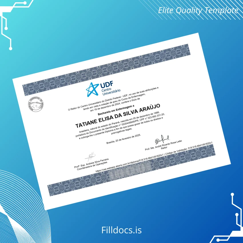 This template is a high-quality, editable diploma form specifically crafted for the Bachelor of Nursing program at Brazil Centro Universitário do Distrito Federal. It comes in both Word and PDF formats, allowing users to personalize every element including names, dates, and official seals. Ideal for those who require a replacement diploma template or want a digital diploma download option that matches official certificate standards.