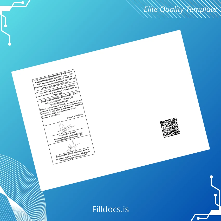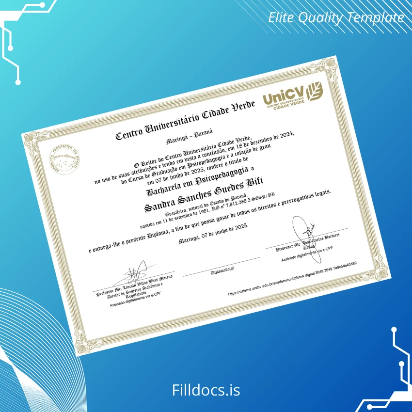 This fillable diploma certificate template delivers a seamless solution for recreating your psychopedagogy bachelor’s degree from Brazil Centro Universitário Cidade Verde. It combines elegant design with professional-grade features tailored specifically for graduates, educational institutions, and administrative professionals who value both authenticity and flexibility. The digital format ensures instant access, enabling users to promptly replace lost or expired diplomas with an accurate and visually appealing document.