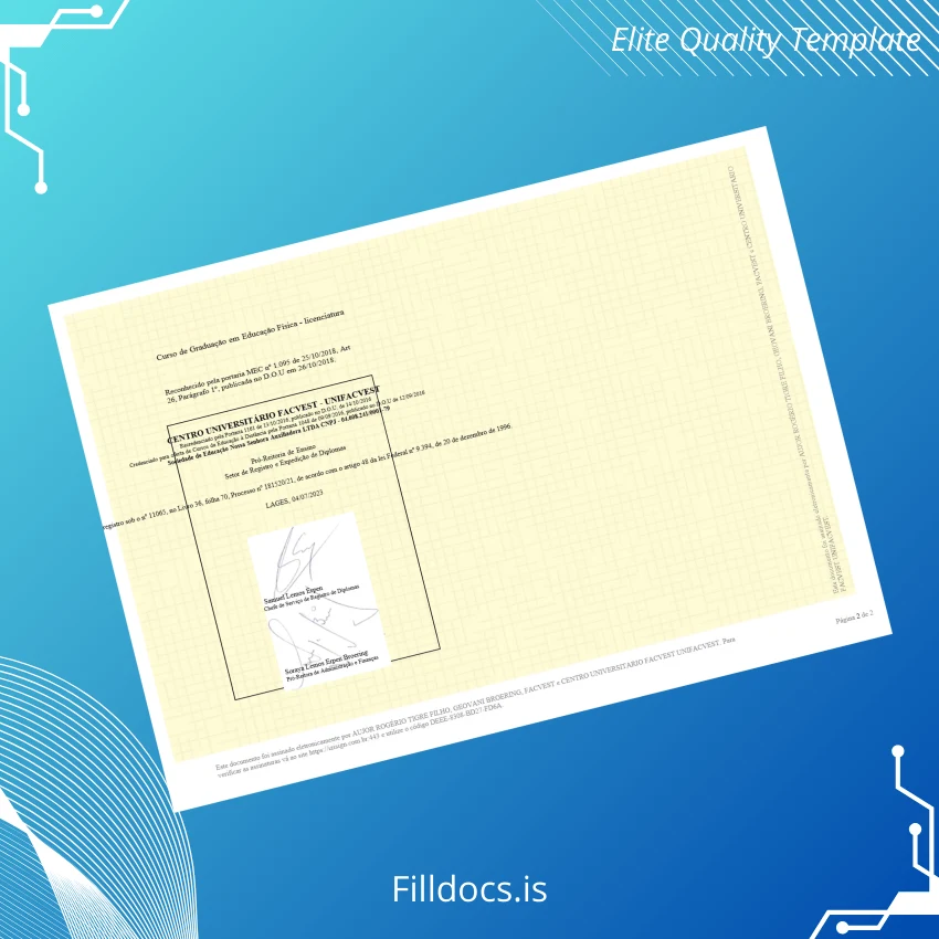 This Brazil Centro Universitário Facvest UNIFACVEST Bachelor of Physical Education Degree Certificate Template is a premium, editable diploma design that offers a professional and customizable solution for individuals needing a replacement or blank diploma form. Carefully crafted for accuracy and aesthetic appeal, it serves as a reliable digital diploma download for educators, students, and institutions alike.