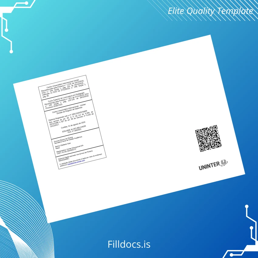 This professionally crafted template serves as an editable diploma form that replicates the authentic layout and design of the Bachelor of Education in Pedagogy credential from Centro Universitário Internacional UNINTER, Brazil. It provides users with a novel and digital diploma download that ensures the highest fidelity in presentation and format, suitable for numerous academic and professional requirements.