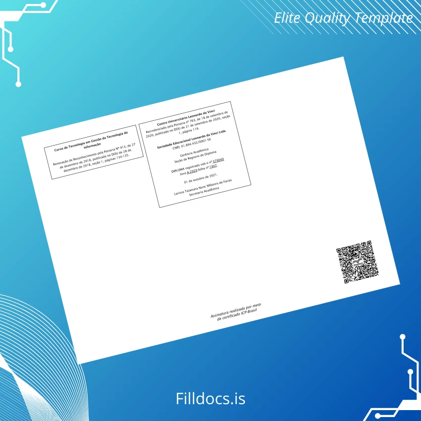 This template serves as a blank diploma form specifically crafted for the Brasil Centro Universitário Leonardo da Vinci Technology degree in Information Technology. It is a digital file available in Word and PDF formats, making it accessible and adaptable for users globally who need to create or replace their university diploma without compromising on quality or accuracy.