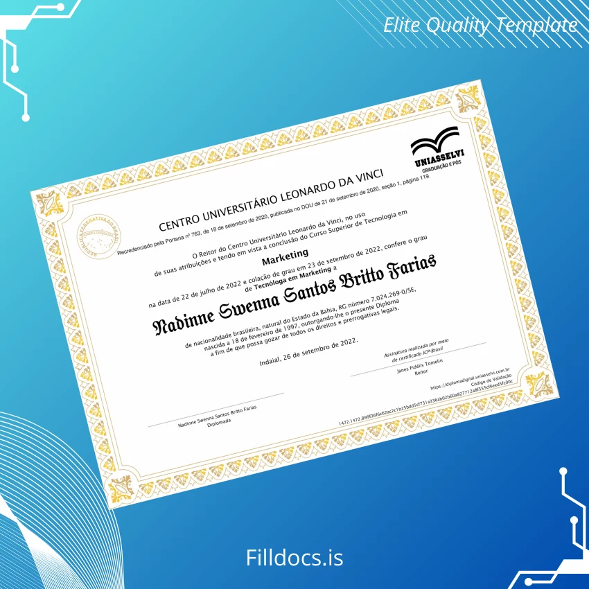 This template is a versatile, editable academic diploma for the Brazil Centro Universitário Leonardo da Vinci Technology Degree in Marketing. It enables users to create a professional digital diploma download that closely mimics official degree certificates, ensuring authenticity and precision for various professional applications.