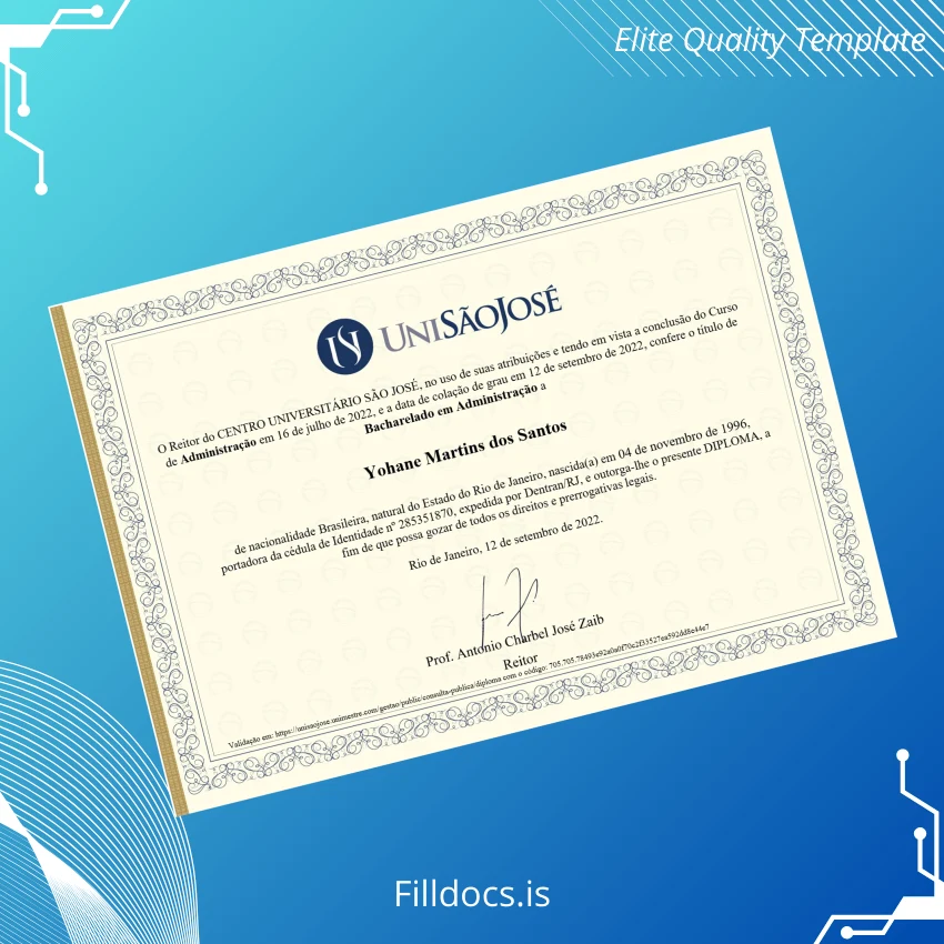 Discover the Brazil Centro Universitário São José Bachelor of Administration Template – Word/PDF, a professionally designed, fillable diploma template ideal for creating authentic replacement diplomas quickly and efficiently. This customizable degree template is perfect for professionals who need a reliable, editable diploma template that accommodates all essential academic details, ensuring your achievements are presented formally and with distinction.