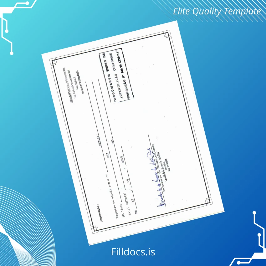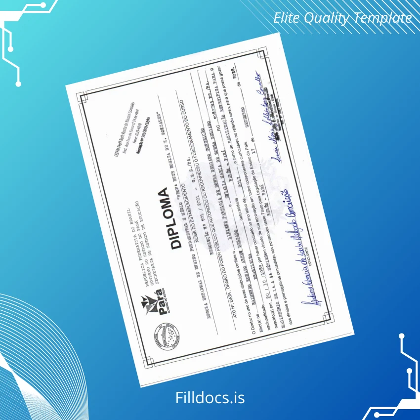 This template is a fillable diploma form designed to replicate official Brazilian educational diplomas, provided in easy-to-edit Word and PDF formats. It serves as a replacement diploma template or a novelty diploma design for academic presentations and official recognitions.