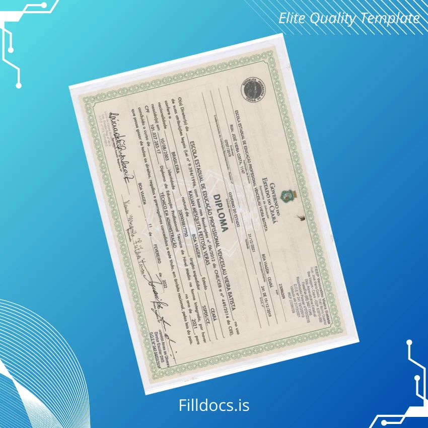This fully customizable diploma template is crafted specifically for the Brazil Escola Estadual de Educação Profissional Venceslau Vieira Batista, providing a blank diploma form that you can personalize to reflect official credentials. Designed for ease of use, it serves as an ideal solution for creating replacement diplomas or certificates with a novel, professional appearance.
