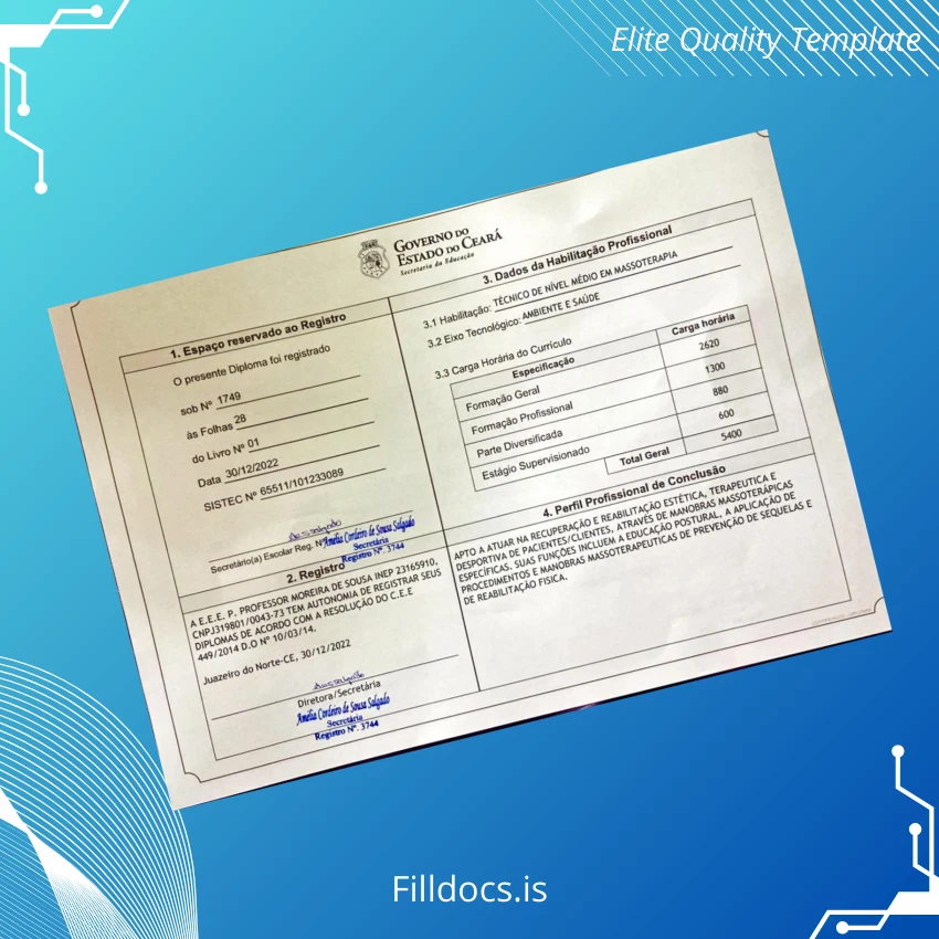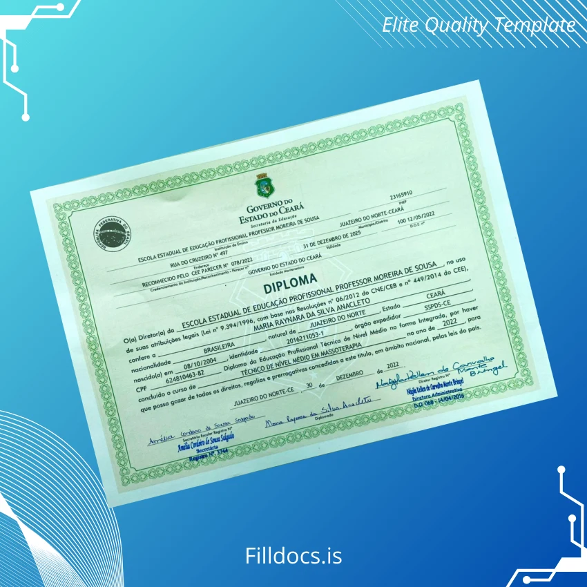 This fillable diploma form is a thoughtfully designed document tailored specifically for the Brazil Escola Estadual de Educacao Profissional Professor Moreira de Sousa institution, providing a professional and novel certificate layout ideal for massage therapy qualifications. It functions as a replacement diploma template that users can download instantly, edit promptly, and print with outstanding clarity. The blank diploma form is perfect for educational institutions, technical schools, and graduates needing a high-quality, customizable diploma design.