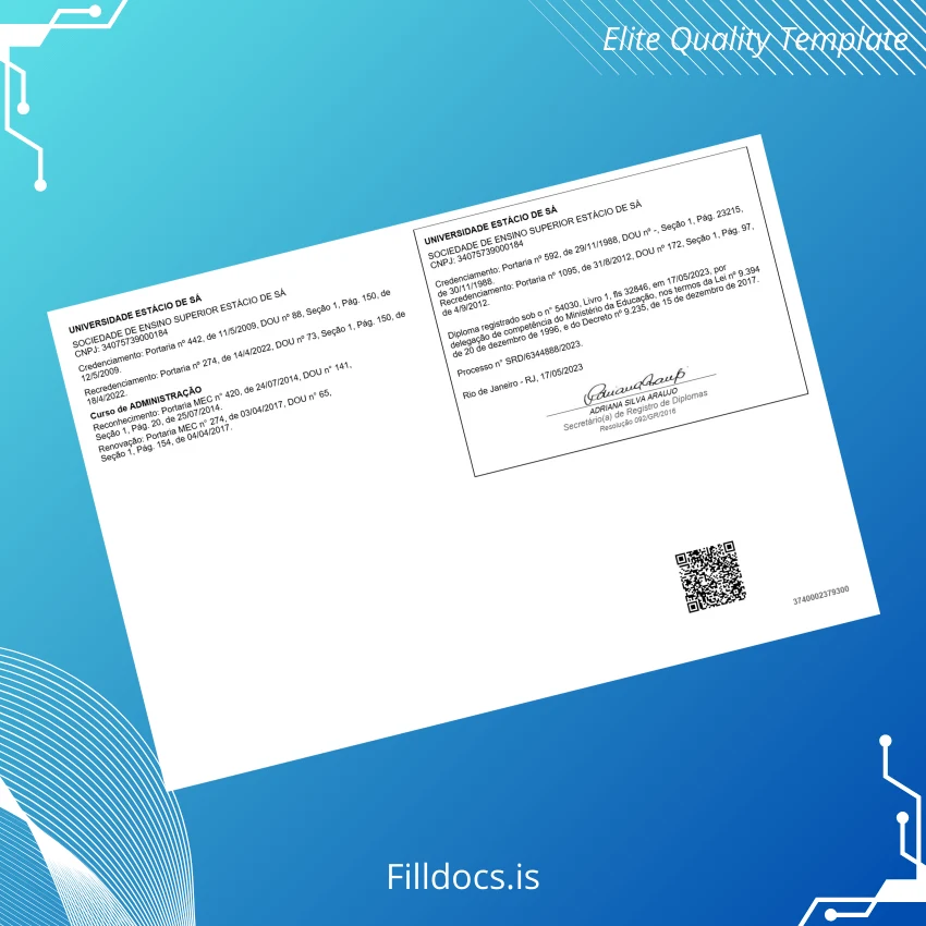 Discover the Brazil Estácio University Bachelor of Business Administration Diploma Template – Word/PDF, a professionally designed, fillable diploma template tailored for business graduates seeking a fast and reliable way to replace or customize their official documentation. This digital diploma download combines ease of use with exceptional design standards, making it an invaluable resource for personalized degree presentations.