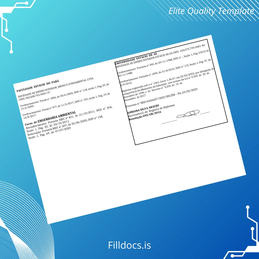 Discover the Brazil Estácio University Bachelor of Environmental Engineering Template – Word/PDF, a meticulously designed fillable diploma certificate template tailored for professionals requiring a seamless and high-quality replacement or customizable academic document. This template offers an ideal solution for graduates, administrative staff, and educators seeking a practical and visually authentic diploma format.