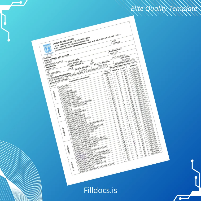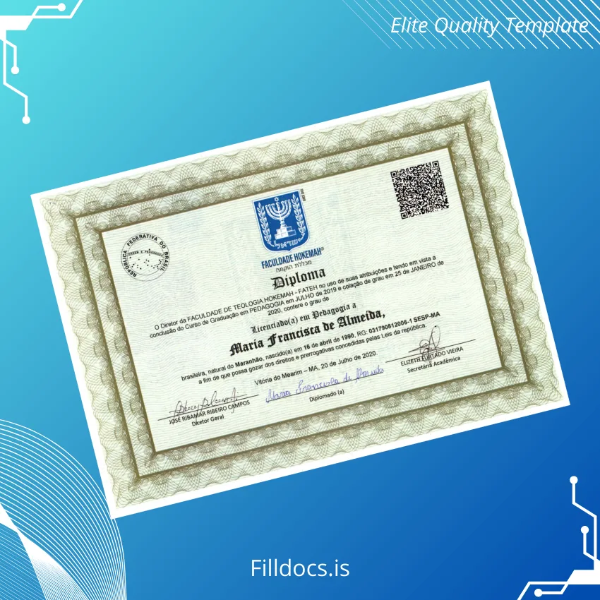 The Brazil Faculdade de Teologia Hokkien Bachelor Diploma Template – Word/PDF offers a professionally designed, editable diploma certificate perfect for academic institutions and graduates who require a customizable and fillable diploma form. This digital file allows users to easily personalize the diploma, ensuring it reflects the official credentials accurately while maintaining an elegant and formal aesthetic.