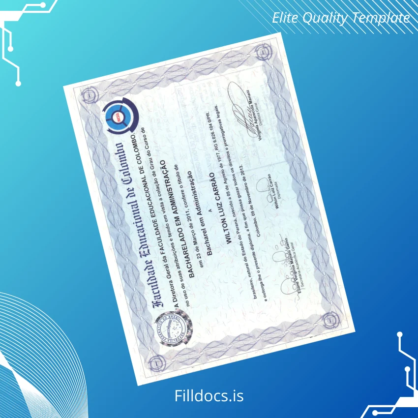 Fillable Brazil Faculdade Educacional de Colombo Bachelor in Administration Template – Word/PDF lets you easily customize your diploma with professional print-ready quality.