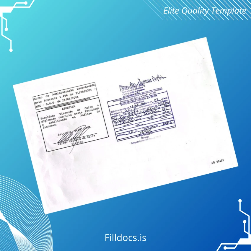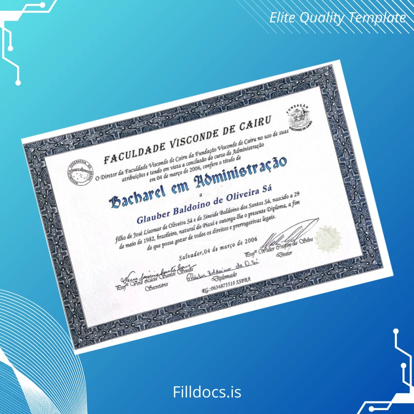 Discover the Brazil Faculdade Visconde de Cairu Bachelor of Business Administration Template – Word/PDF, a professionally designed fillable diploma ideal for professionals seeking a customizable and authentic replacement document. This digital diploma download offers a seamless way to create a high-quality, blank diploma form with ease.