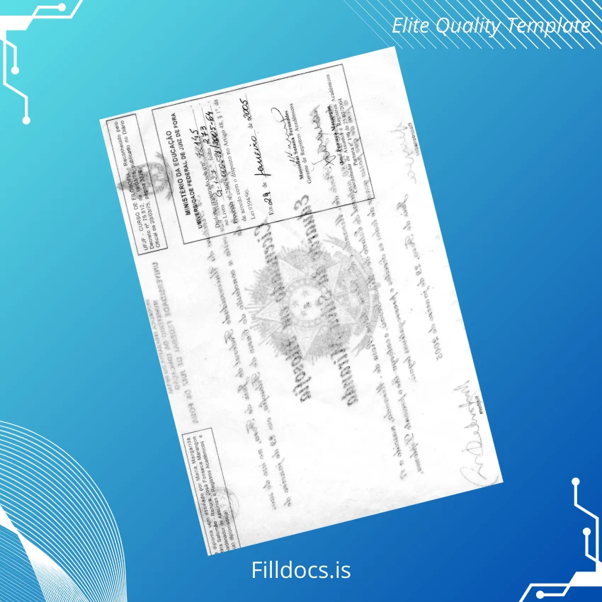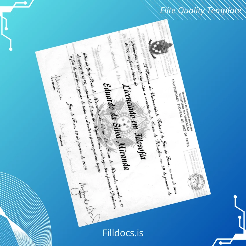 This fillable template is a digital diploma downloaded in Word and PDF formats that can be customized to meet individual needs. It is an ideal solution for users who need a replacement diploma template or wish to generate a unique novelty diploma design swiftly. This blank diploma form adheres to the aesthetic standards reminiscent of the Brazil Federal University of Juiz de Fora, particularly tailored for the Bachelor of Arts in Philosophy degree, making it both authentic and professional.