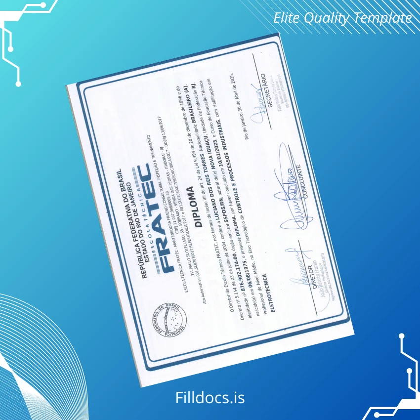 The Brazil FRATEC Diploma in Electrical Engineering Template – Word/PDF is a professional, fillable document designed to meet the needs of individuals requiring a customizable and downloadable digital diploma certificate. This customizable degree template is perfect for students, educators, and professionals who want a reliable and editable diploma format delivered in versatile Word and PDF formats.