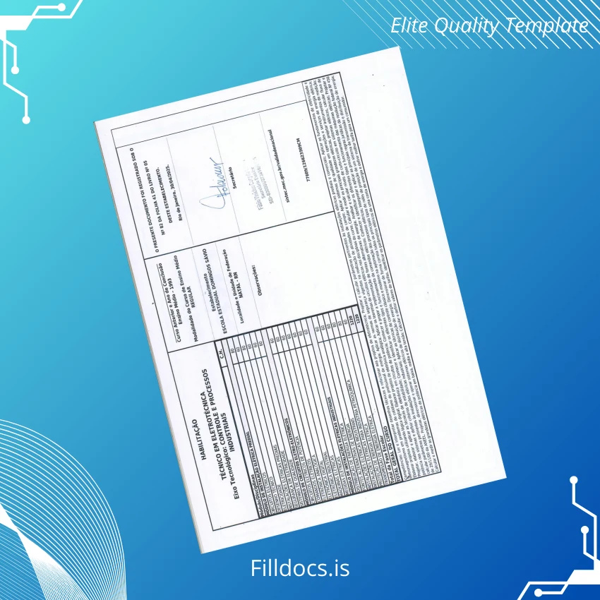 The Brazil Fratec Technical School Diploma in Electrotechnics Template – Word/PDF is a professionally designed, fillable diploma template crafted exclusively for electrotechnics graduates. This template offers a seamless way to create authentic, customizable diplomas with a high degree of graphic precision and ease of editing. Ideal for educational institutions, technical training centers, and individuals needing replacement or personalized diplomas, this product guarantees quality and flexibility in digital diploma creation.
