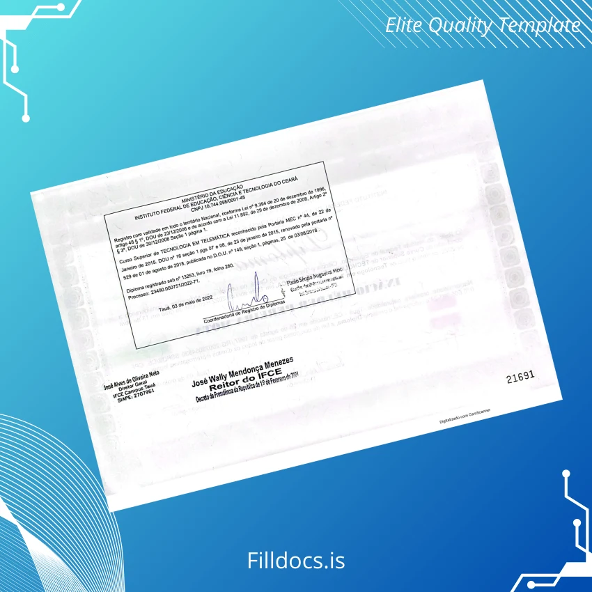 This Brazil Instituto Federal de Educação, Ciência e Tecnologia do Ceará Technology Diploma Template is a versatile, fillable document designed specifically for professionals who need a precise and authentic-looking diploma in editable Word and PDF formats. Crafted for users requiring a swift and reliable solution, this template offers an ideal replacement diploma option for those who have lost their original certification or need a professional copy for official purposes. Whether you’re a graduate seeking a digital diploma download or an institution requiring a blank diploma form for customization, this product delivers unmatched convenience and quality.