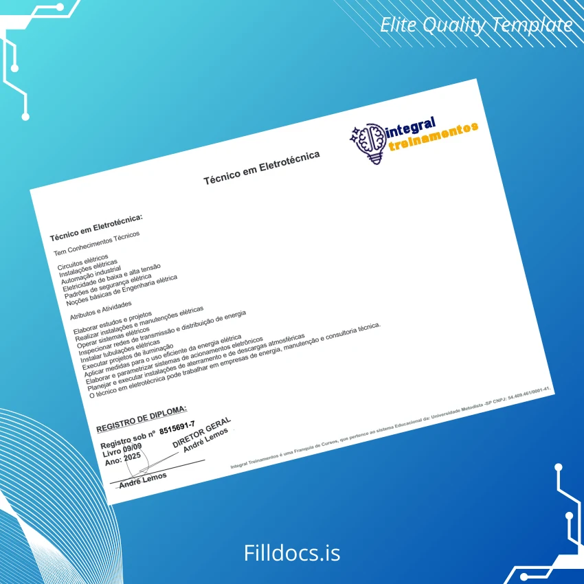 Streamline your document needs with the Brazil Integral Treinamentos Technical Diploma in Electrotechnics Template – Word/PDF, a fillable and customizable diploma certificate designed for professionals requiring a reliable replacement or an original certificate.