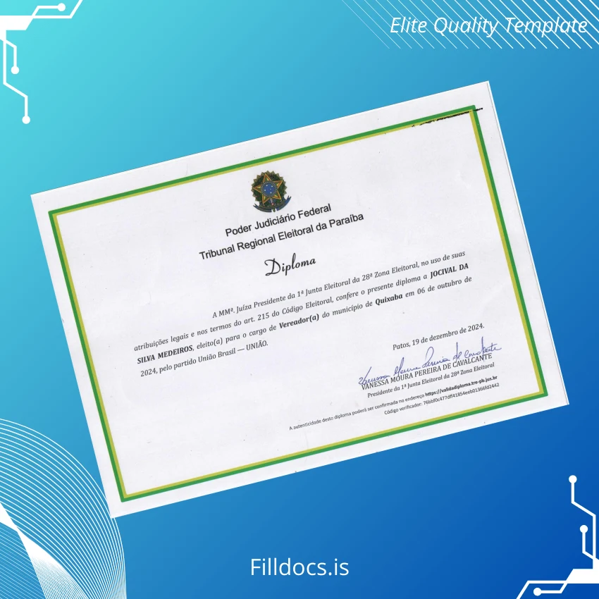The Brazil Tribunal Regional Eleitoral da Paraíba Diploma Template – Word/PDF is a professionally designed, fillable digital certificate template crafted for individuals and organizations seeking a customizable and authentic diploma replacement solution. Tailored specifically for those needing a precise and editable diploma form, this template facilitates swift and seamless updates, allowing users to modify essential details such as names, dates, and official designations while maintaining a professional look.