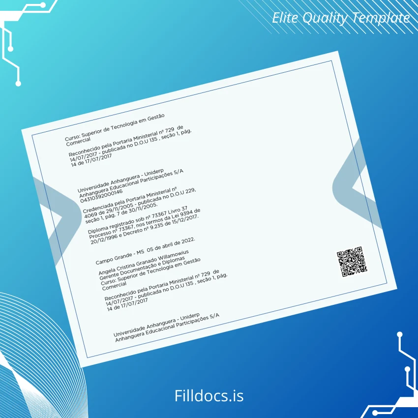 This fillable diploma template offers a professional and customizable solution for creating official documents replicating the Brazil Universidade Anhanguera – Uniderp Technologist in Commercial Management diploma. Perfectly suited for educational institutions, graphic designers, or individuals needing a replacement document, this template combines seamless editable features with print-ready precision.