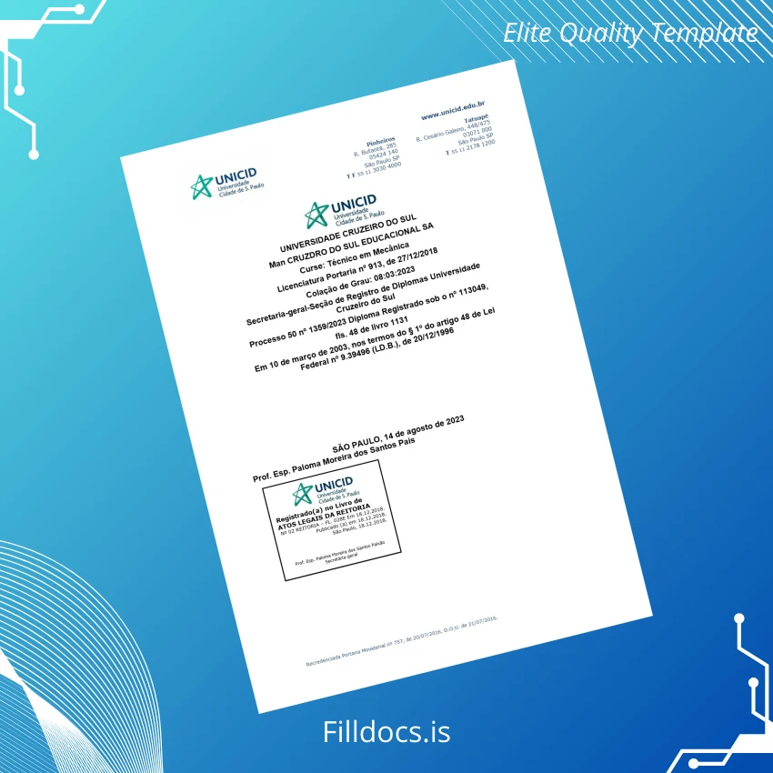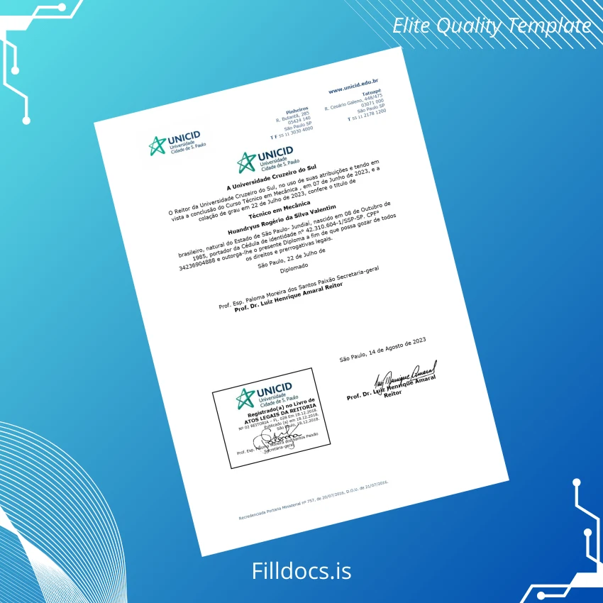 This digital diploma template is a versatile replacement diploma template designed specifically for the Technical Degree in Mechanics awarded by Brazil Universidade Cruzeiro do Sul. Created with precision, it combines an authentic design with editable fields to facilitate quick personalization, making it ideal for individuals who need a blank diploma form for official or educational use.