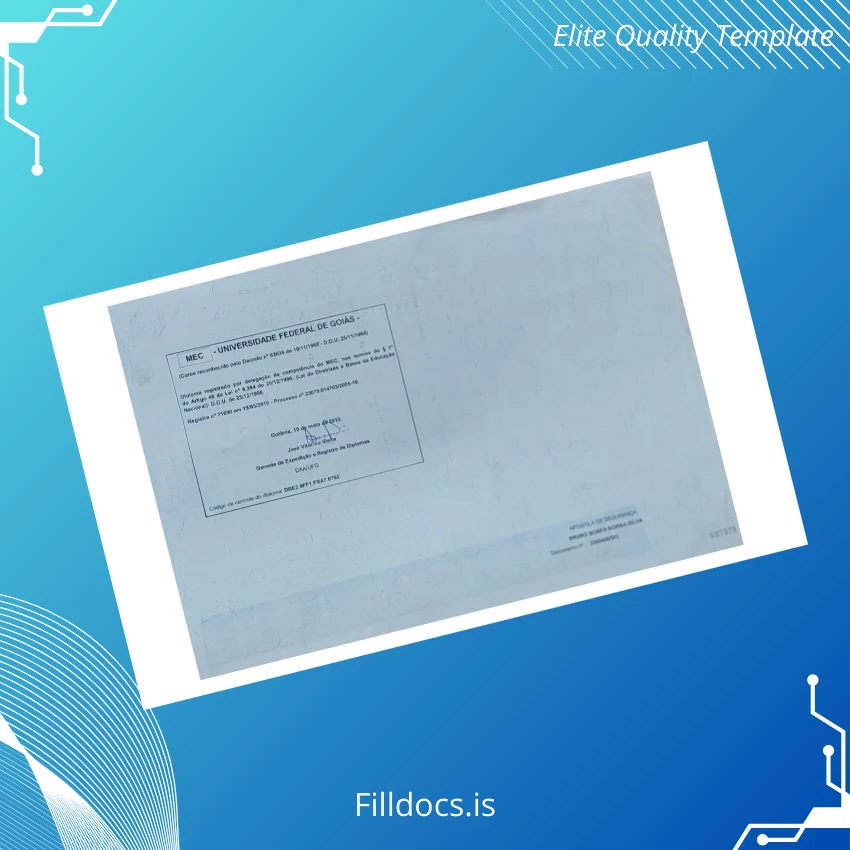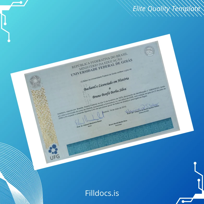 This template is a customizable degree template specifically designed for the Universidade Federal de Goiás Bachelor of Arts in History diploma. It serves as a blank diploma form that allows users to enter their personal information, such as name, graduation date, and other academic details, directly into easily editable fields. This product is ideal for professionals seeking an authentic yet editable document format.