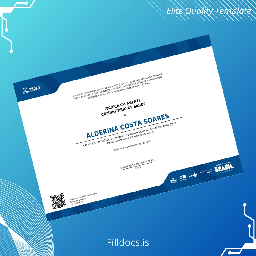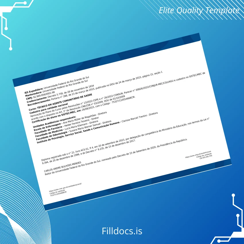 This Brazil Universidade Federal do Rio Grande do Sul Technical Diploma in Community Health Agent Template – Word/PDF is a professional, fillable document template designed for individuals seeking a customizable and high-quality replacement or novelty diploma. Crafted to meet the needs of professionals who require a seamless editable diploma template, this digital download offers precise customization options suited for official and informal usages.
