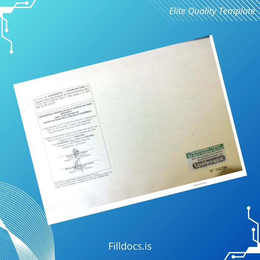 Discover the Brazil Universidade Federal do Sul e Sudeste do Pará Bachelor of Arts in Geography Template – Word/PDF, an expertly designed fillable diploma certificate solution tailored for professionals seeking a seamless way to create authentic and customizable degree documents. This digital template offers an optimal balance between ease of use and professional quality, designed to meet the needs of educators, administrative staff, and individuals requesting replacement diplomas with precision.