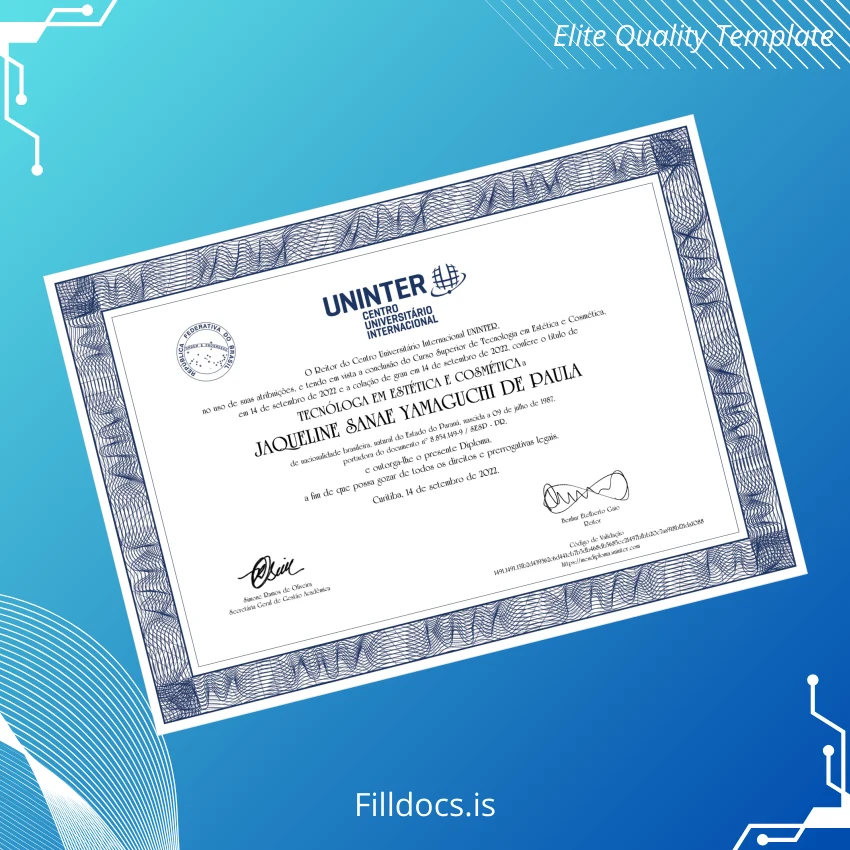 Fillable Brazil Universidade Internacional UNINTER Technologist in Aesthetics and Cosmetics Diploma Template – Word/PDF for easy, professional customization.