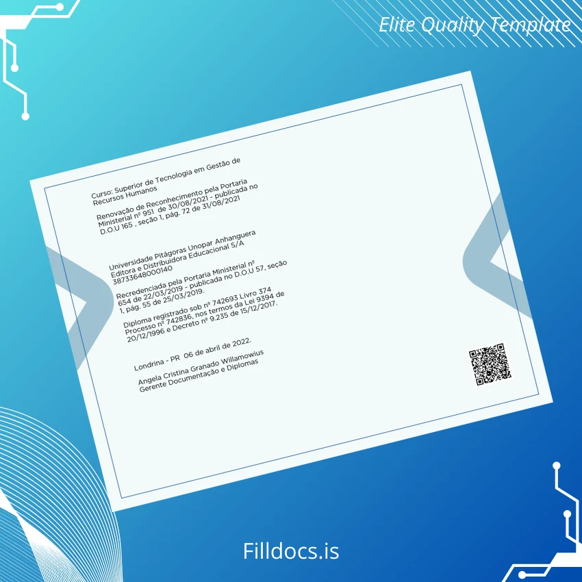 This template is a sophisticated digital diploma download created specifically for those seeking a customizable degree template that replicates the Brazil Universidade Pitágoras Unopar Anhanguera Associate Degree in Human Resources Management. Ideal for professionals who have lost or need an updated version of their credential, it provides a blank diploma form where you can input your personal information seamlessly. Its novelty diploma design balances authenticity with user-friendly features.