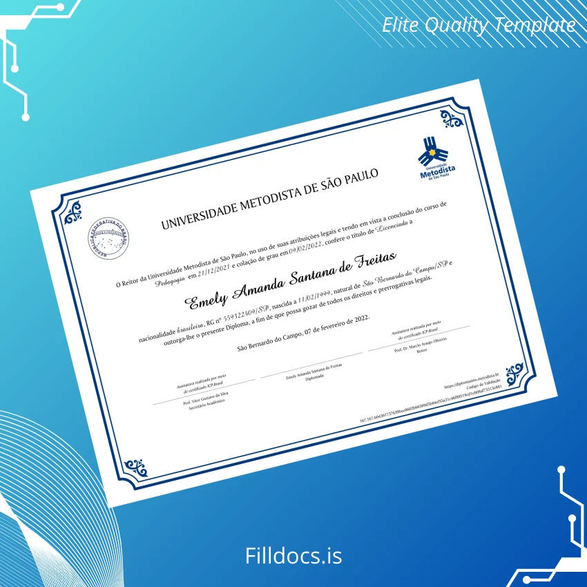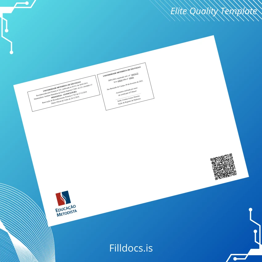 This is a customizable diploma certificate template specifically formatted for the Bachelor of Education degree from Brazil University Metodista de São Paulo. It is designed as a high-quality digital download available in both Word and PDF formats, which makes it easy to edit and personalize. Ideal for those requiring a replacement or a new diploma with a novel design, this digital diploma download brings together elegance and usability for official documentation needs.