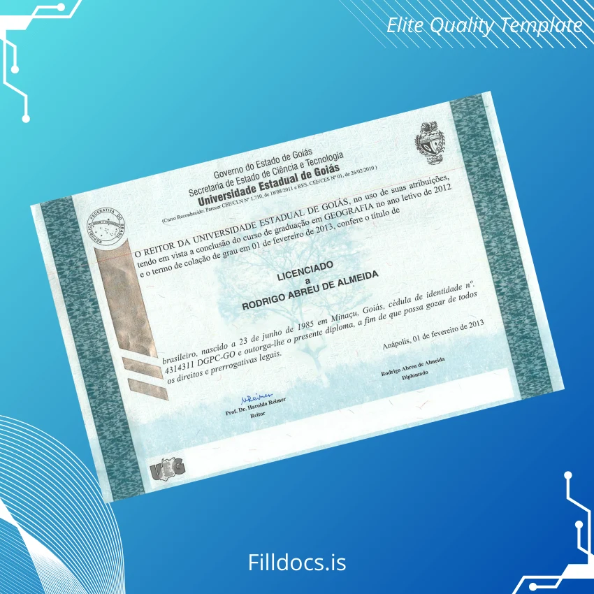 This template is a digital diploma form tailored for the Brazil University of Goiás Bachelor of Geography degree. It serves as a customizable degree template that can be effortlessly edited to replicate an official diploma’s look and feel. Ideal for those seeking a replacement diploma template or a novel presentation design, it ensures your credentials are visually impressive and accurate.