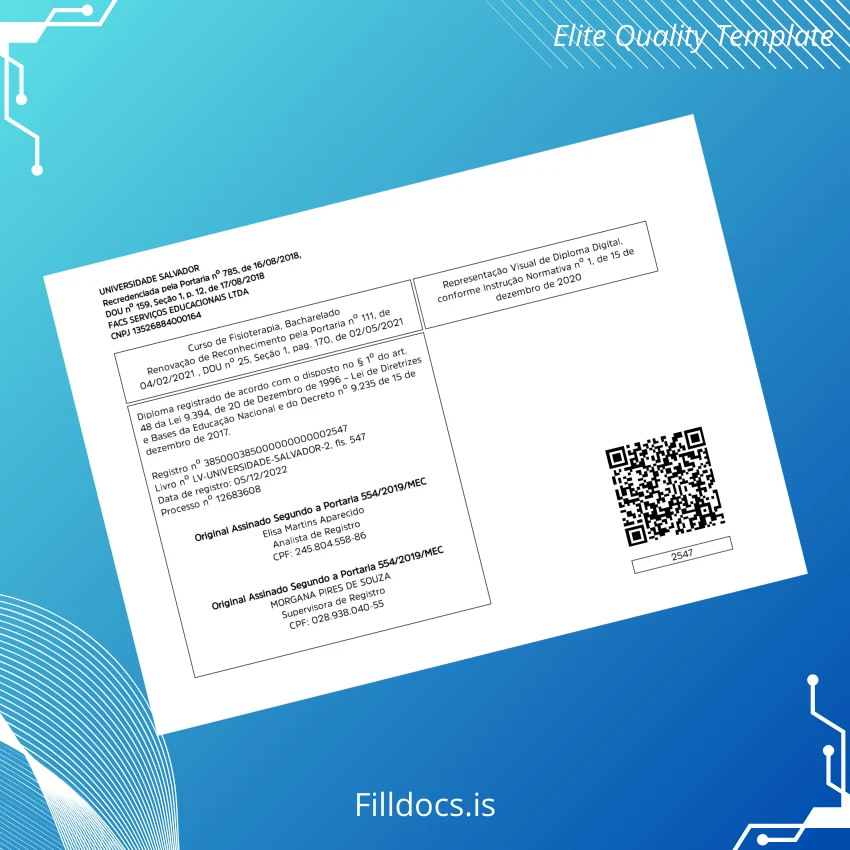 Discover the Brazil University of Salvador Bachelor of Science in Physiotherapy Template – Word/PDF, a professionally designed fillable diploma template tailored for quick customization and flawless presentation. This digital diploma download is perfect for professionals seeking a reliable replacement diploma template or those needing a customizable degree template for various documentation purposes. With its clean design and editable fields, this template provides an efficient solution for creating authentic-looking diplomas swiftly.