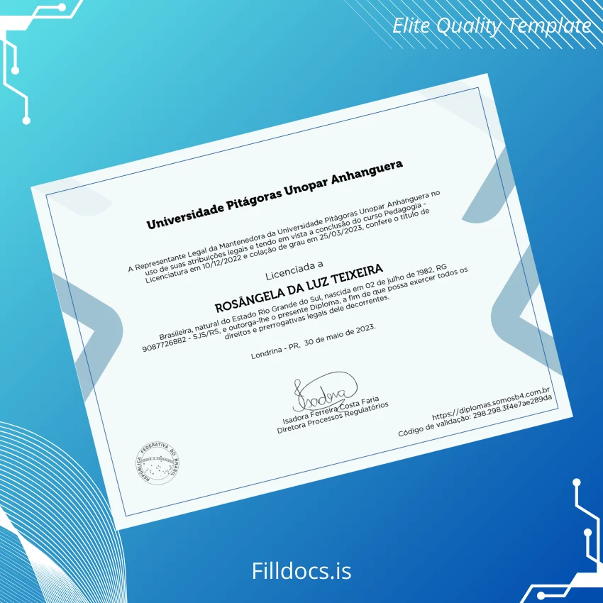 This template is a fully editable, high-resolution bachelor’s degree diploma tailored specifically for Brazil University Pitágoras, Unopar, and Anhanguera institutions, designed for the Pedagogy faculty. It serves as a precise replacement diploma template that allows users to insert legitimate details directly into the document, enabling quick generation of professional diplomas without loss of authenticity or quality.