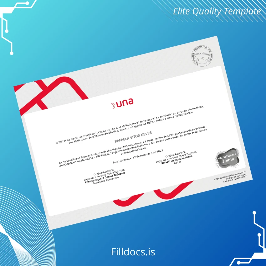 Discover the Brazil University UNA Bachelor of Science in Biomedicine Template – Word/PDF, a meticulously crafted fillable diploma certificate designed for professionals seeking a quick and seamless solution to document replacement. This digital template perfectly combines editable convenience with a refined professional aesthetic, ensuring your certificate stands out with authenticity and clarity.